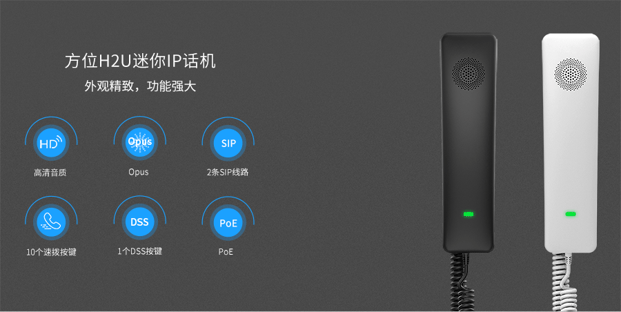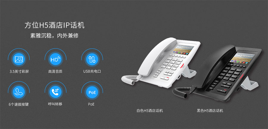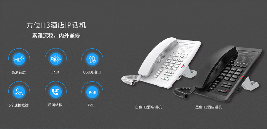 方位H2U迷你 IP话机外观时尚小巧,功能强大。方位H2U话机拥有黑白两种颜色,支持2条SIP线路,10个快速拨号键,1个可编程DSS按键,话机手柄还配备了高清的扬声器。方位H2U话机支持桌面/壁挂两种安装方式,支持PoE供电和电源供电。不仅可以作为酒店话机,还适用于多种应用场景,如学校、医院、超市、住宅等。![]() 方位白色H3/H5酒店IP话机