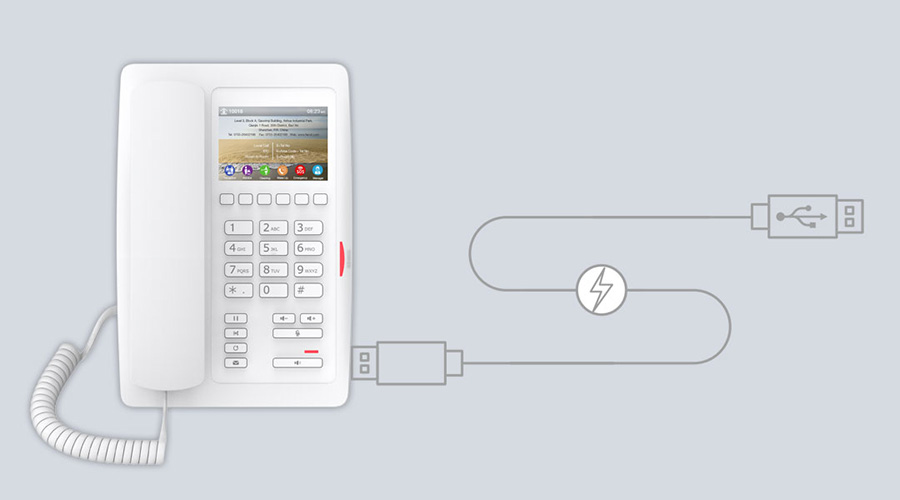 方位H5酒店话机(白色) 集高颜值与硬实力于一体的酒店话机 方位H5酒店话机专为酒店行业定制,集高颜值与硬实力于一体。它外观精致、时尚,拥有优雅白和沉稳黑两种颜色,可搭配多种不同装修风格;在音质方面,拥有HD超高清音质,为用户提供“声”临其境的体验;另外人体工程学的设计,使音质优质的同时手感同样出众。 ![]() 不仅是话机,更是贴心小助手 事实上,方位H5酒店话机除了提供优质的通话服务外,更是一个贴心小助手:内置USB接口,可实现手机、平板电脑的便捷充电,出国无需携带充电转换器。 ![]() 更有“温度”的住房体验 房间脏了,需要打扫?下一趟旅程,需要订票?需要帮忙,想呼叫前台?肚子饿了,想要订餐?入睡前,希望按时被唤醒?方位H5酒店话机6大自定义按键可快速拨号,一键呼叫清洁、服务、前台、叫餐、叫醒等服务,客人只需动动手指即可发布住中需求并得到及时响应,酒店服务快人一步。 ![]() 无缝对接酒店现有管理系统 方位H5酒店话机等全系列SIP终端均拥有开放互联的特性,支持与酒店原有系统无缝兼容,可保护酒店已有投资不被浪费;同时各终端的互联互通,还极大拓展了系统的应用场景。 事实上,方位拥有一系列丰富的酒店话机终端,除了H5话机外,还包含高性价比的H3,迷你话机H2U,墙挂话机H2S等热门机型。