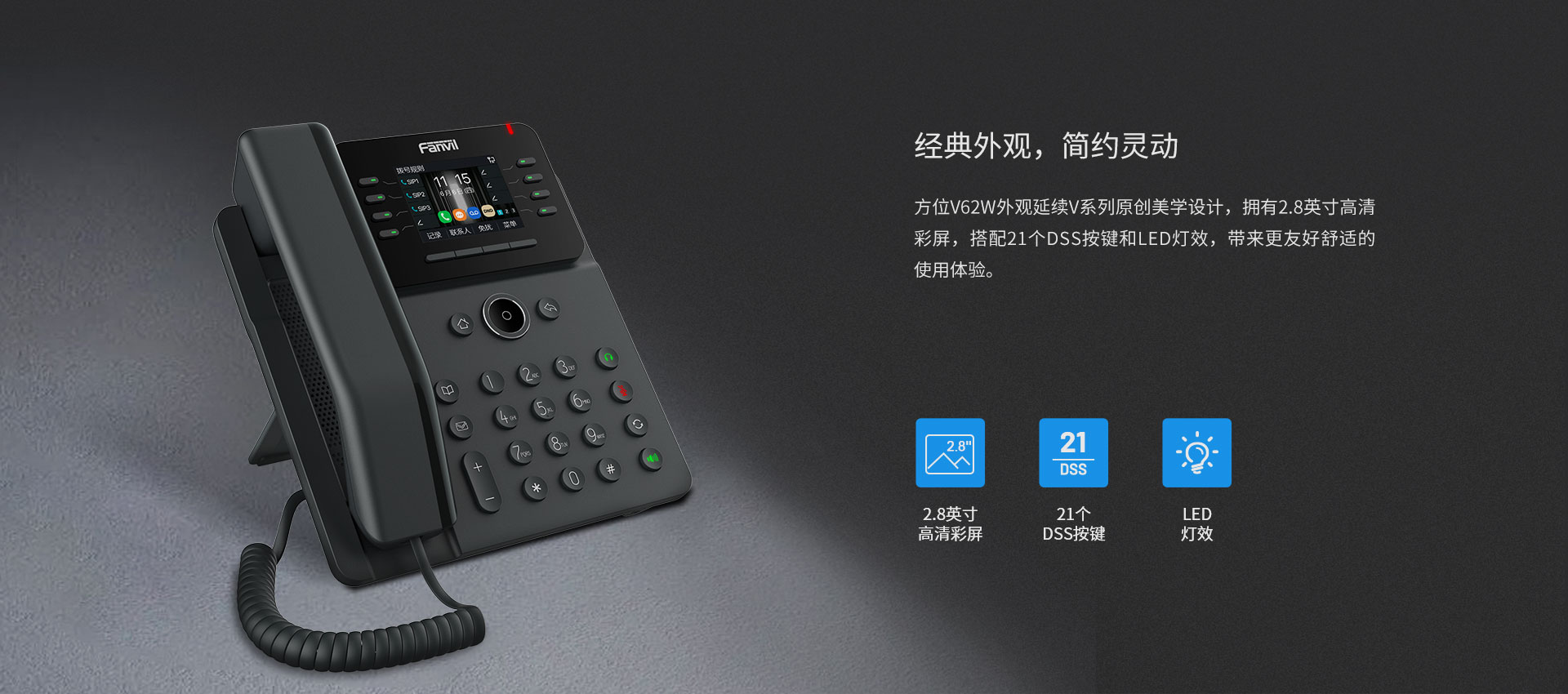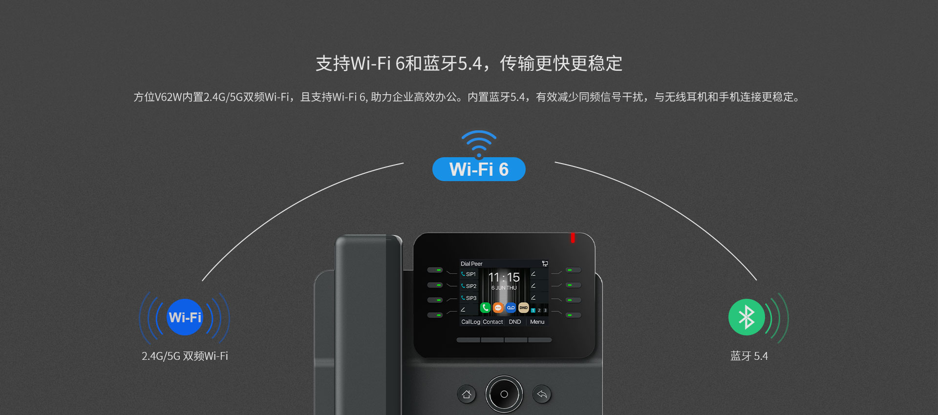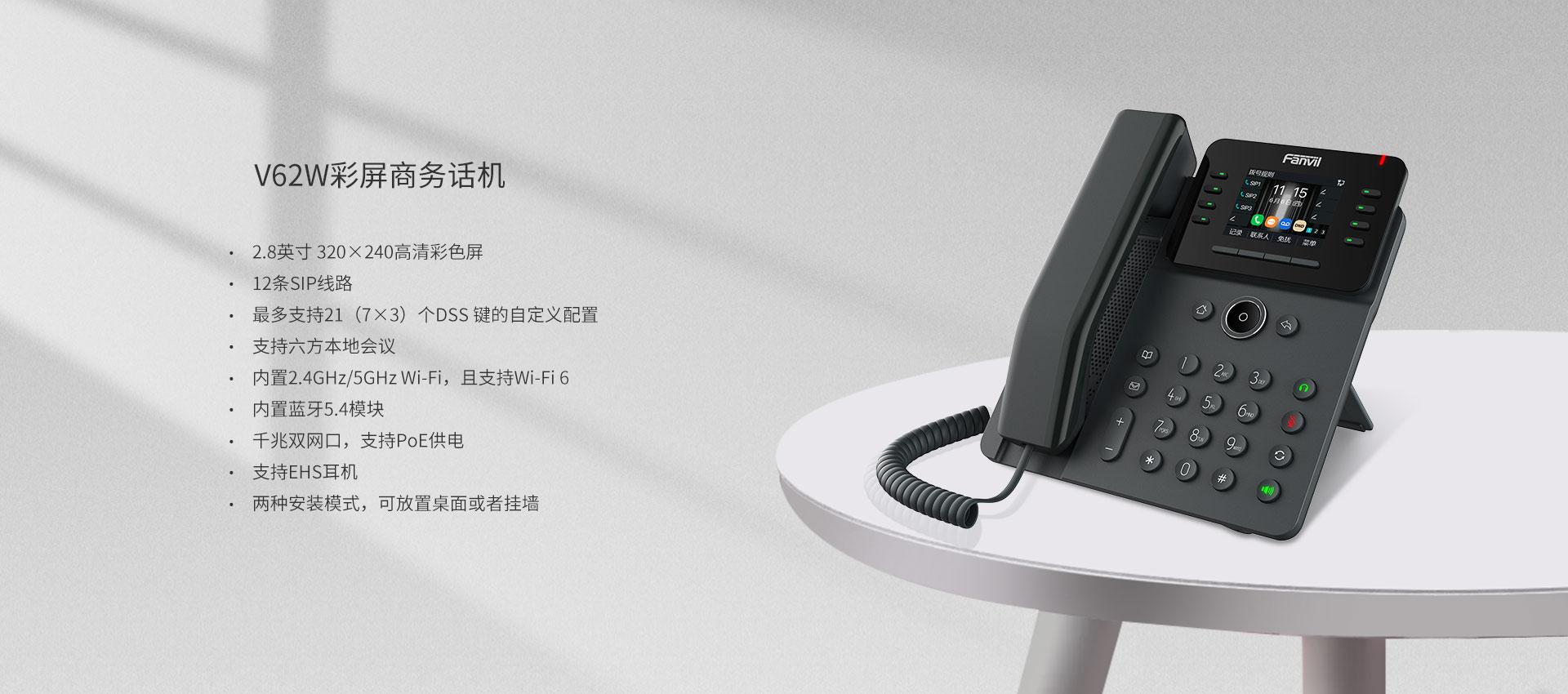 方位V62W是一款外观时尚、性能卓越的千兆彩屏商务话机。采用2.8英寸(320x240)高清彩色液晶屏,拥有12条SIP线路,支持高清语音和6方语音会议,支持千兆双网口和PoE供电,内置2.4G/5G双频Wi-Fi(Wi-Fi 6)和蓝牙5.4,可满足不同的企业应用场景,为用户提供卓越的交互体验和舒适的即时通讯服务。