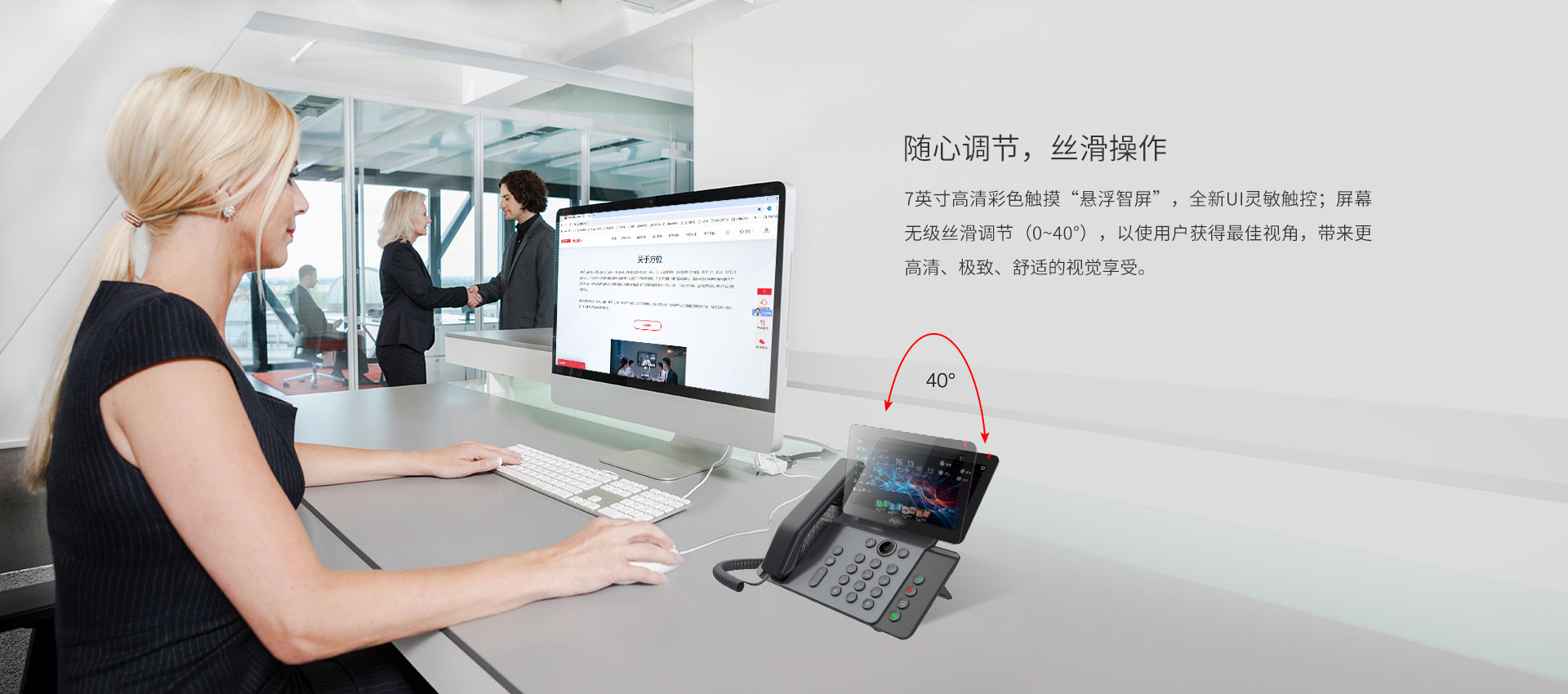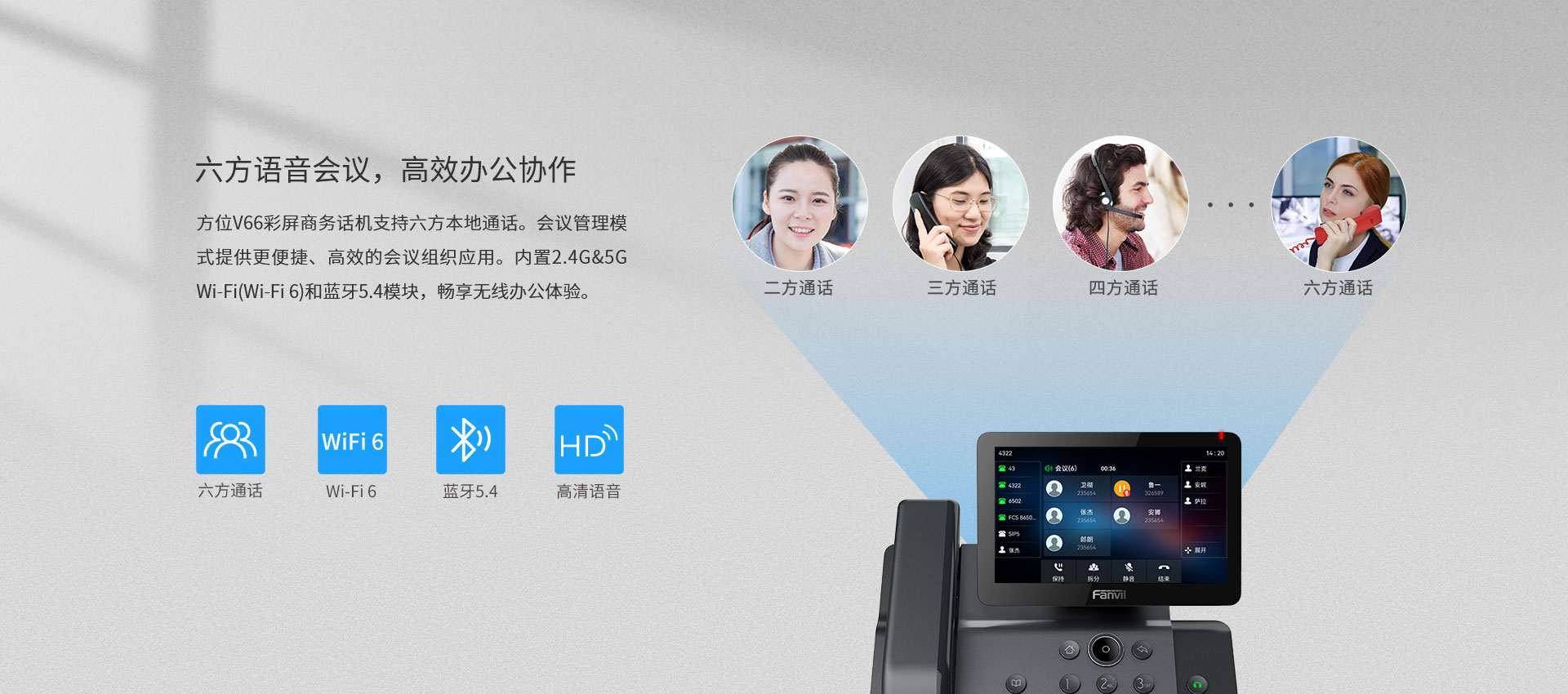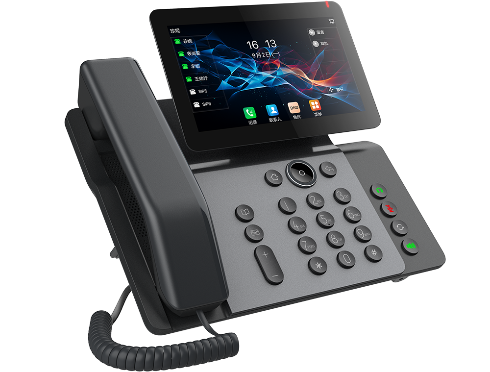 方位V66是一款集音视频通讯与智能为一体的高效商务彩屏话机,专为追求沟通的高级商务用户打造。其独特的美学设计风格与7英寸高清彩色“悬浮智屏”相得益彰。设备提供超高清音质,内置蓝牙5.4及2.4G & 5G Wi-Fi,支持Wi-Fi 6,为用户提供卓越的交互和舒适的即时互联沟通体验。