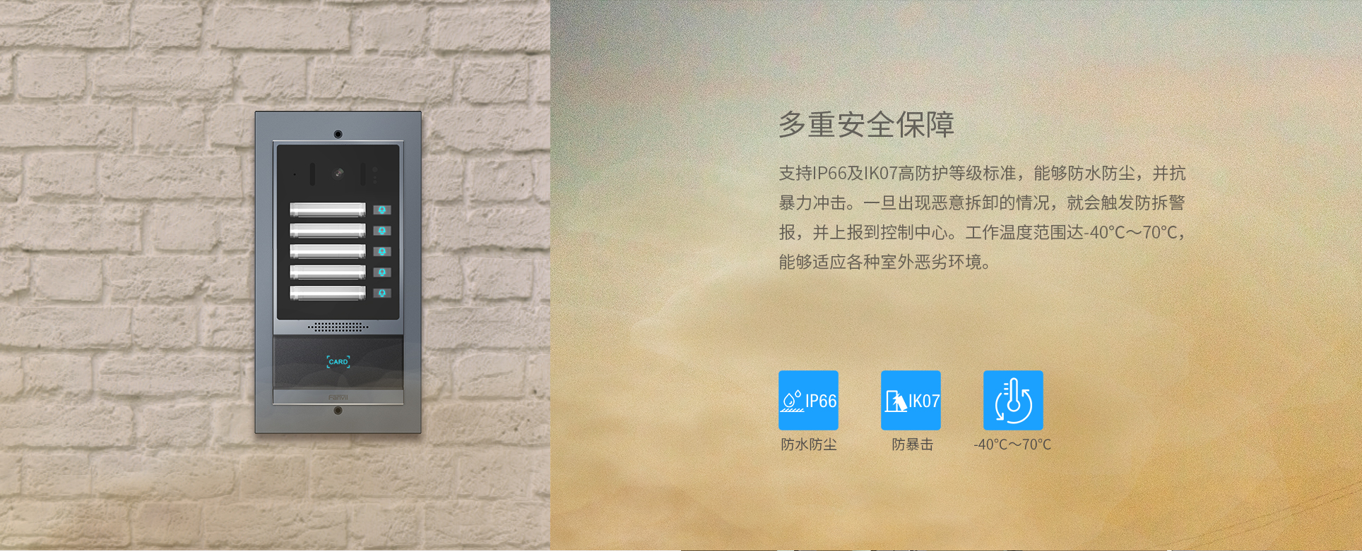 i63是集门禁、对讲和安防功能于一体的SIP门禁产品。i63采用极具科技感的设计和轻奢级智造工艺,配备5个带指示灯的速拨按键。i63安全系数高,具备IP66及IK07高防护等级标准,适用于户外场景。它支持多种开门方式,实现门禁管理;配备200W像素摄像头,一键进行音视频通话。i63支持SIP协议和ONVIF协议,支持安防设备联动,兼容各大主流平台,可定制成各类场景解决方案,适用于各种高级公寓楼、办公楼、社区和工业园区中。