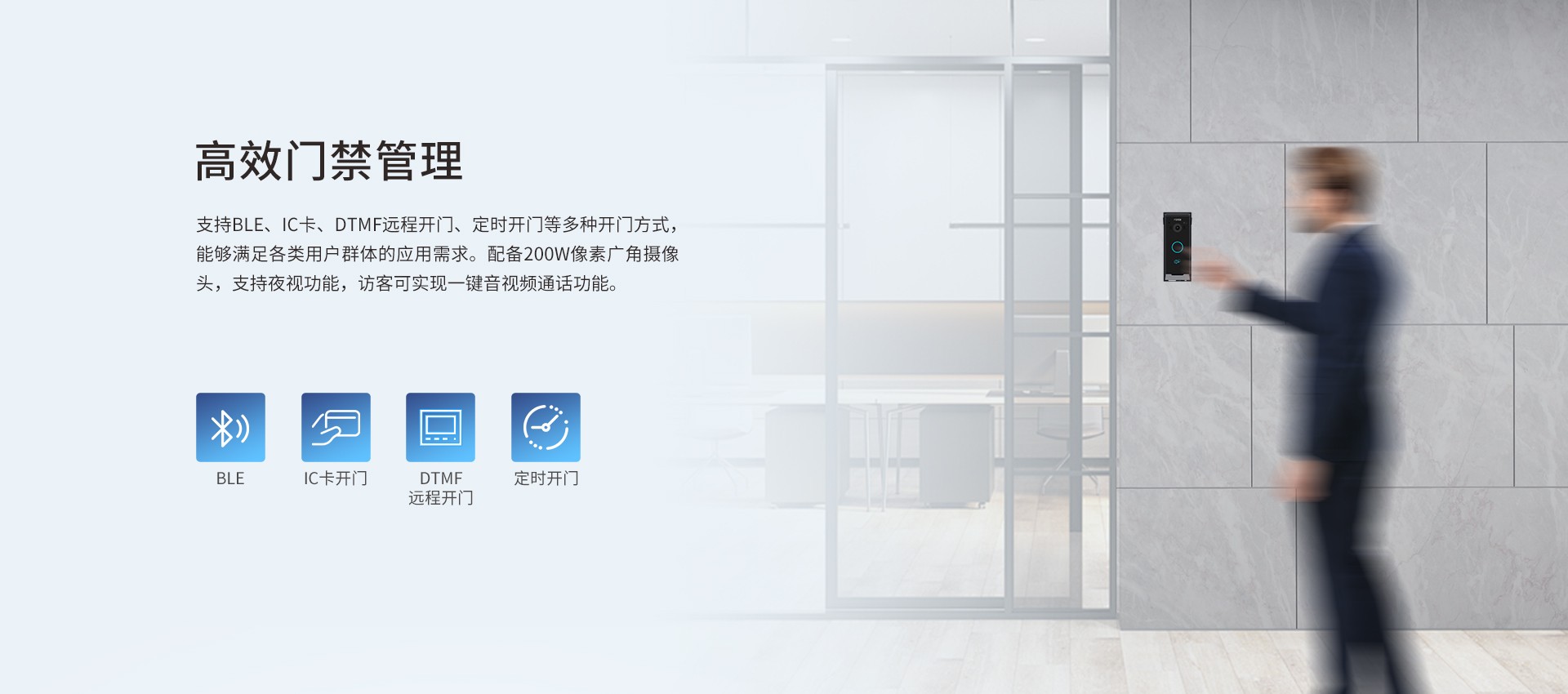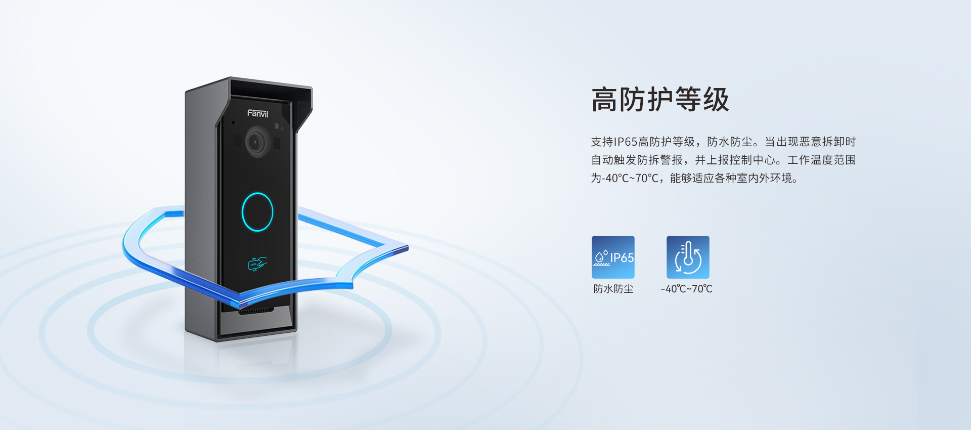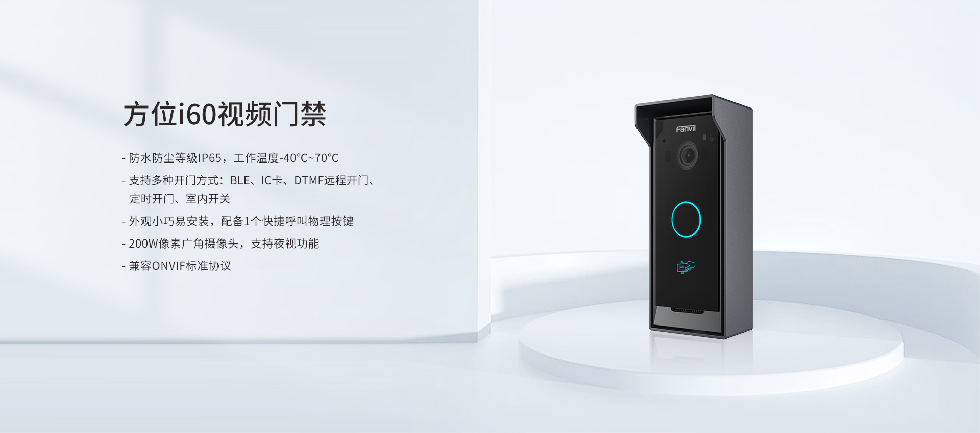 方位i60视频门禁是一款集门禁、对讲和安防功能于一体的SIP门禁产品。设备占用空间小,安装简单,配备1个速拨按键,具备IP65防护等级,适用于各种室内外场景。配备200W像素摄像头与支持多种开门方式,一键进行音视频通话,实现门禁高效管理。支持SIP协议、ONVIF协议和安防设备联动,兼容各大主流平台,可定制成各类场景解决方案,适用于各种别墅、公寓楼、社区等环境。