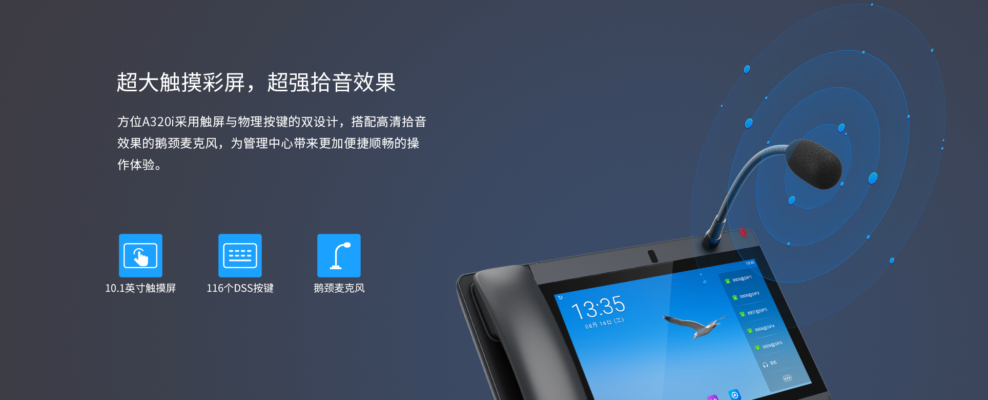 方位A320i是专门针对行业用户需求研发的一款可视大屏寻呼台话机产品,枪灰色、白色可选,满足不同喜好及场景需求。配备鹅颈麦克风和PTM按键静音手柄,支持高清语音通话。拥有10.1英寸彩色高清触摸屏,搭载安卓9.0操作系统,为用户带来更加流畅和智能化的使用体验。兼容标准SIP协议,可作为监控中心、指挥中心管理主机使用,可对管理辖区内的主机和分机进行呼叫、双向对讲、监听/监视、广播喊话。A320i能够让企业最大化地提升日常业务管理效率和应急情况处理能力。